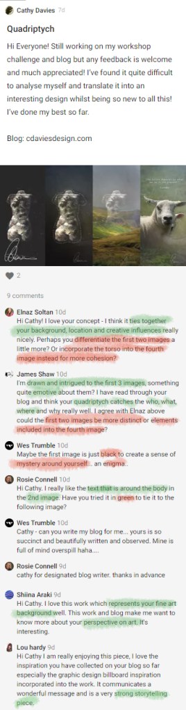 I really enjoyed the video making process and how it produced a more filmic response which was more reflective of my fine art perspective. I would like to explore this in more depth in future tasks. During my tutorial, Stuart suggested being more ‘painterly’ with typography. Even though I adjusted my use of type and added more interactive transitions to accommodate the tone of the work, I feel that I could have been more expressive with it. In the future I’d like to be more experimental with type, specifically through motion graphics and hand illustrated typography.