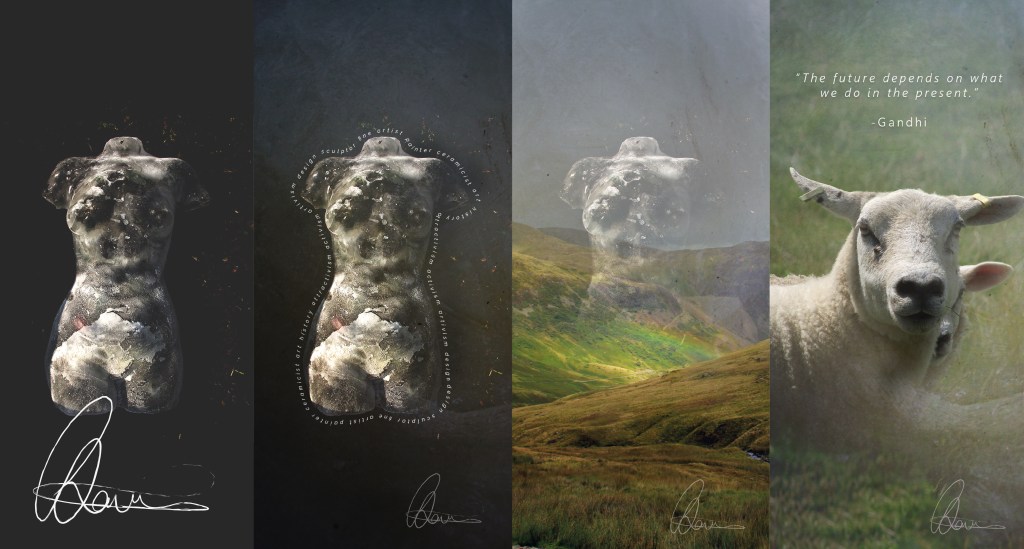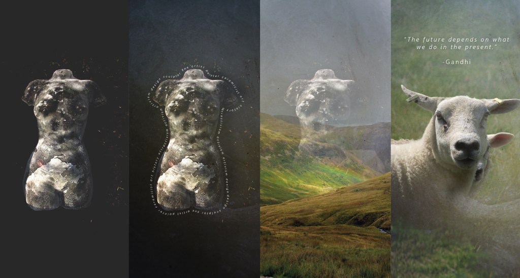 Being situated between the Staffordshire Moorlands and Cheshire Peak District, I am heavily inspired by the landscape, so I incorporated landscape photography through blended layers to create an ethereal tone. The concluding image captures a poignant moment I had photographing a ewe guarding her young. Being very engaged in contemporary issues such as climate change and animal rights, I am motivated by design as a communicative tool which offers sense of agency and purpose in response to cultural change.