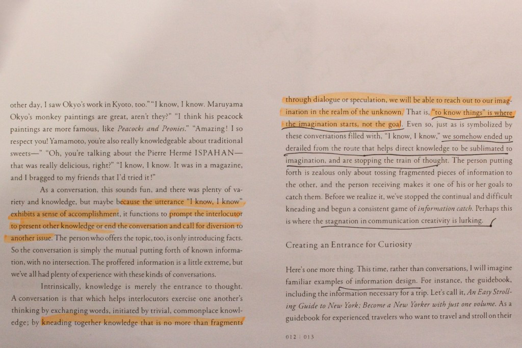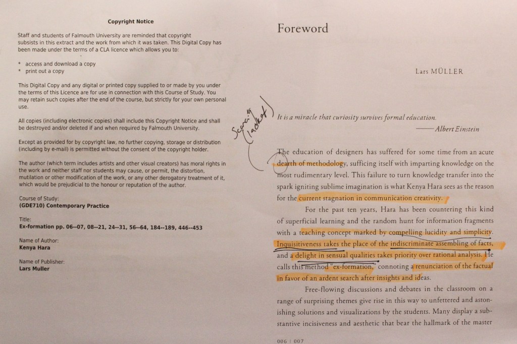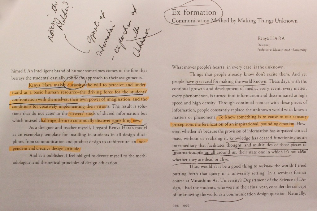 Berger asserts that the process of seeing depends upon habit and convention, arguing that a ‘mystification’ occurs, when raw perceptions are contaminated by the application of words and theory to images. In contrast, children ‘directly interpret images by connecting them to their own experiences’. Having studied art history and theory, I feel that words and theory is necessary to facilitate conceptual and historical understanding, however in the case of noticing the unseen and generating new perspectives, ‘mystification’ exemplifies the creative obstacle that Kenya Hara’s idea of ‘Exformation aims to remove: in the absence of ‘information’ which can prohibit curiosity and unique enquiry, original creative responses can be generated.