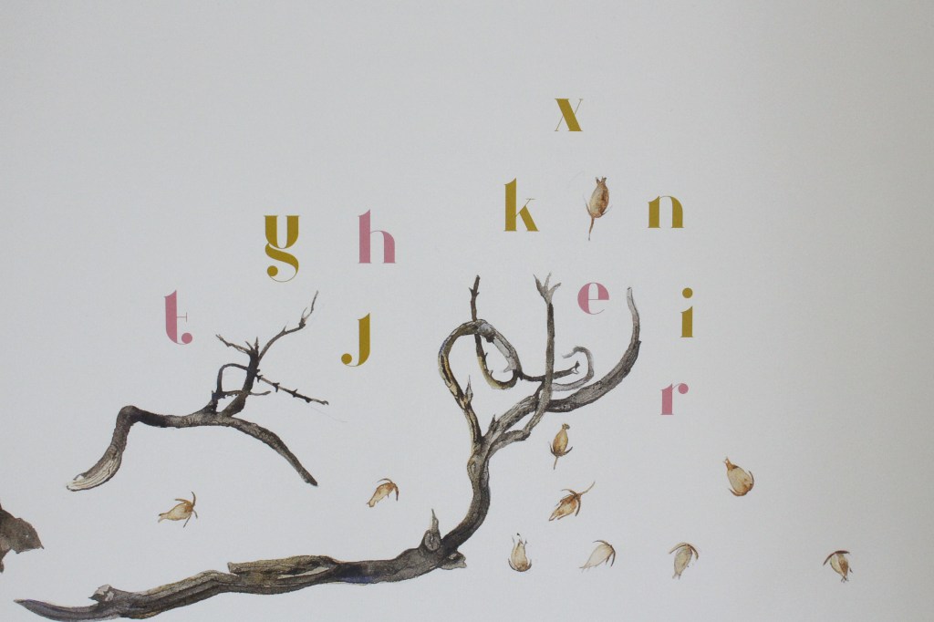 - Arrangement of typography, very simplistic, traditional alignment contrasting with more illustrative arrangement of text to mirror the movements and processes in nature, almost like dispersing of seed.