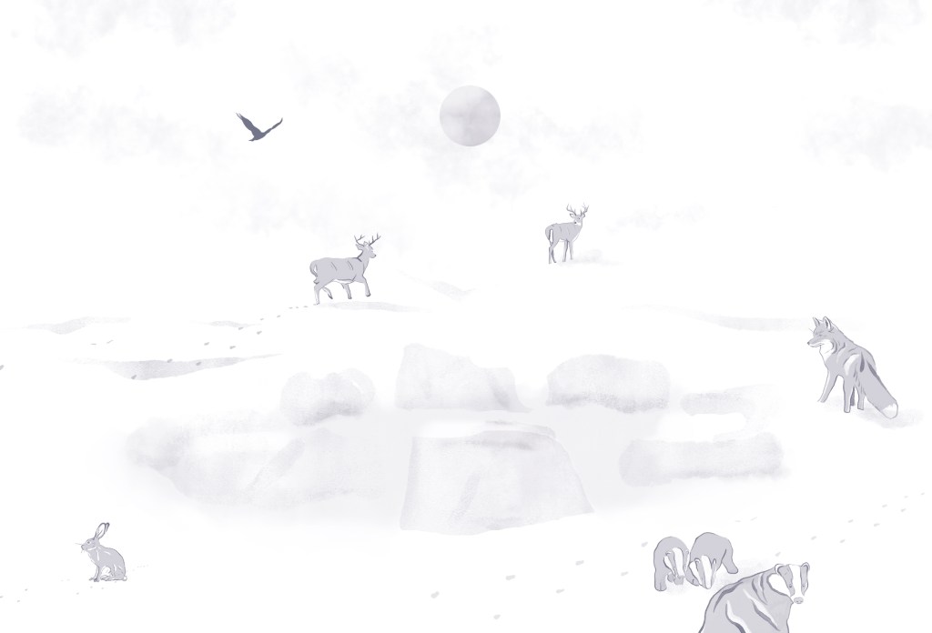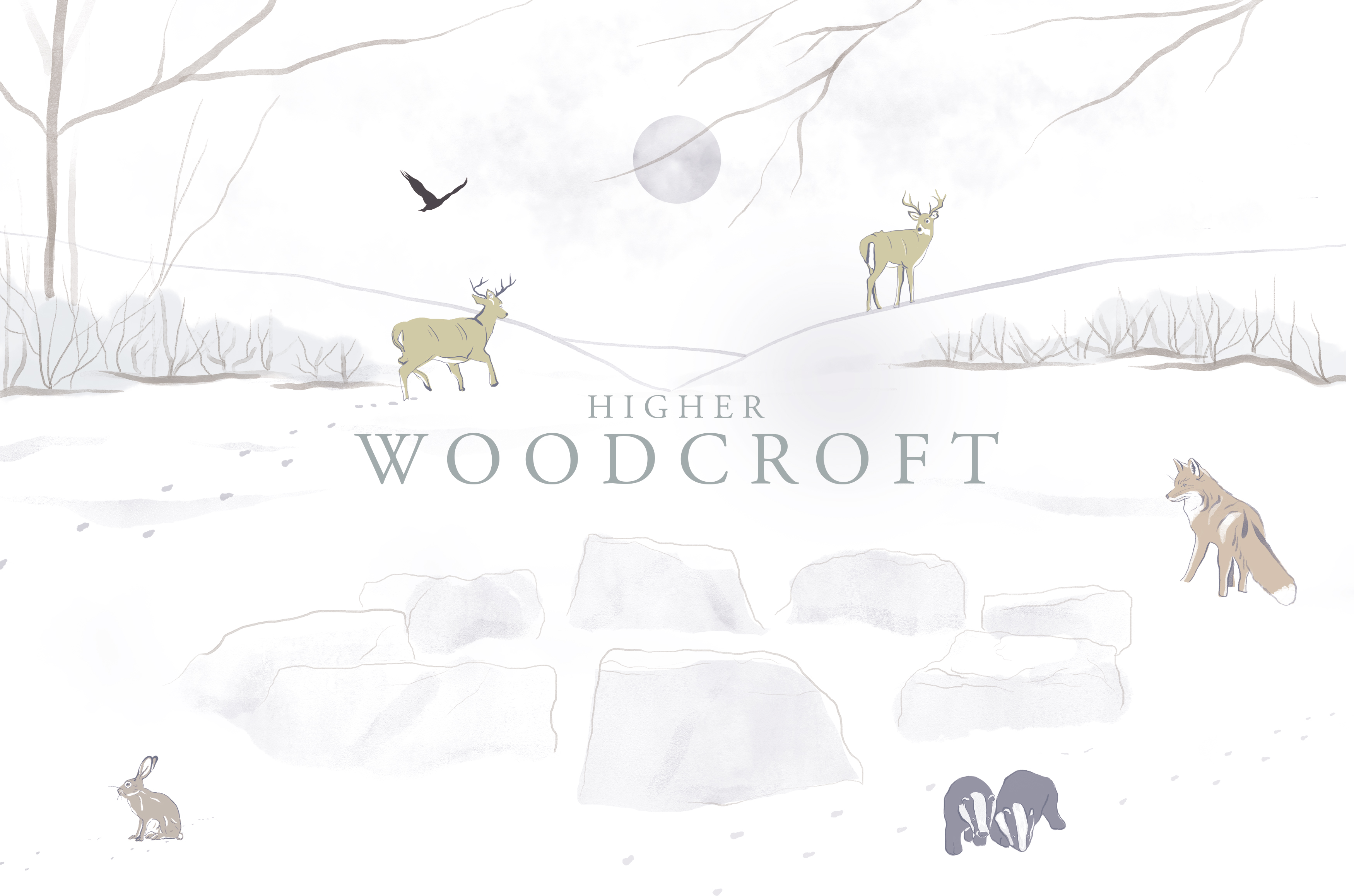 In this design, I wanted to create an illustration that represents my feelings of mysticism and wander regarding my location, inspired by the architectural remnants of Woodcroft House, and the wildlife that has reclaimed its grounds after it was demolished in 1935. Specifically I wanted to render the nocturnal species that I found evidence of during my research, in physical relationship with Woodcroft’s house’s remnants in order to communicate the overarching themes of place, time, decay, nature and renewal.