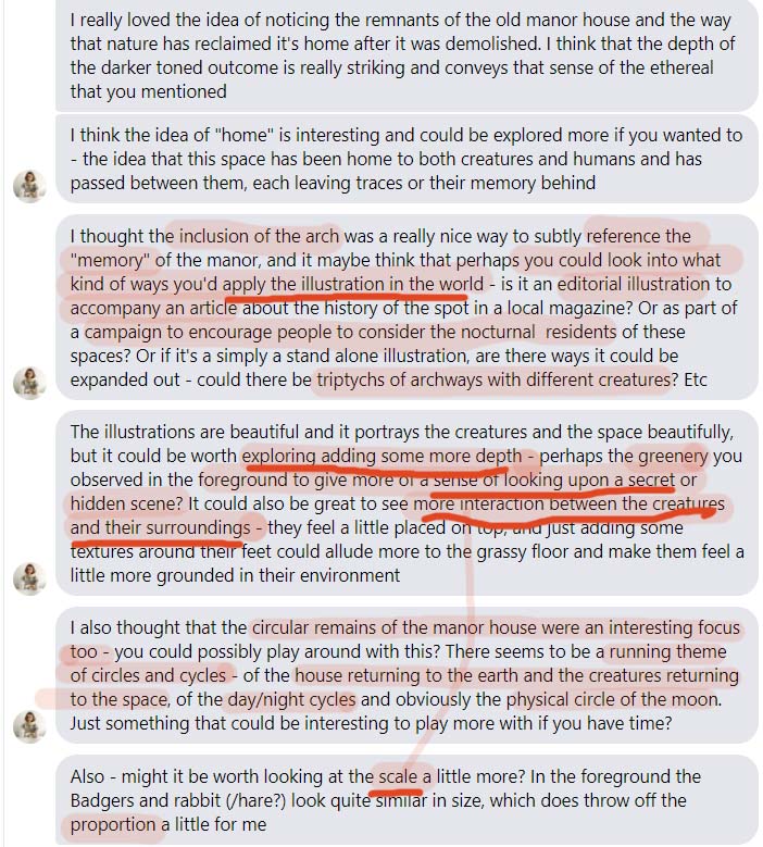Annie’s positive feedback on the dark geometric archway idea stimulated further reflection on how various aspects of the design could be developed into a hanging printed artwork or editorial design. Although I did try to explore this idea, my technical approach of digital illustration in photoshop layers became too time consuming and complex to execute under the limitations of the weekly brief. In the future, I would like to develop my skills in digital painting in order to develop this idea into an illustrated story or poetry book, using the archways as chapter openings to introduce individual animals characters.