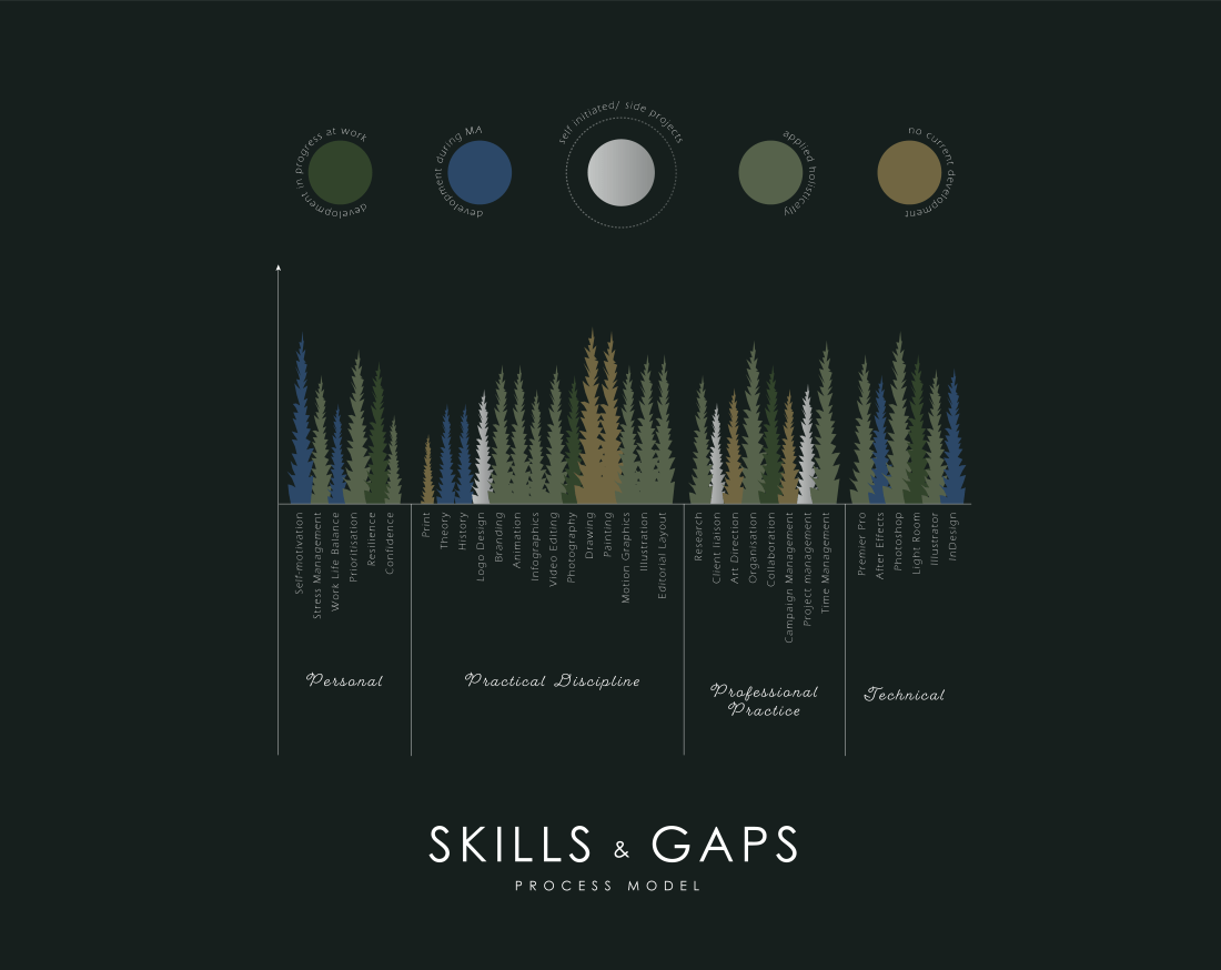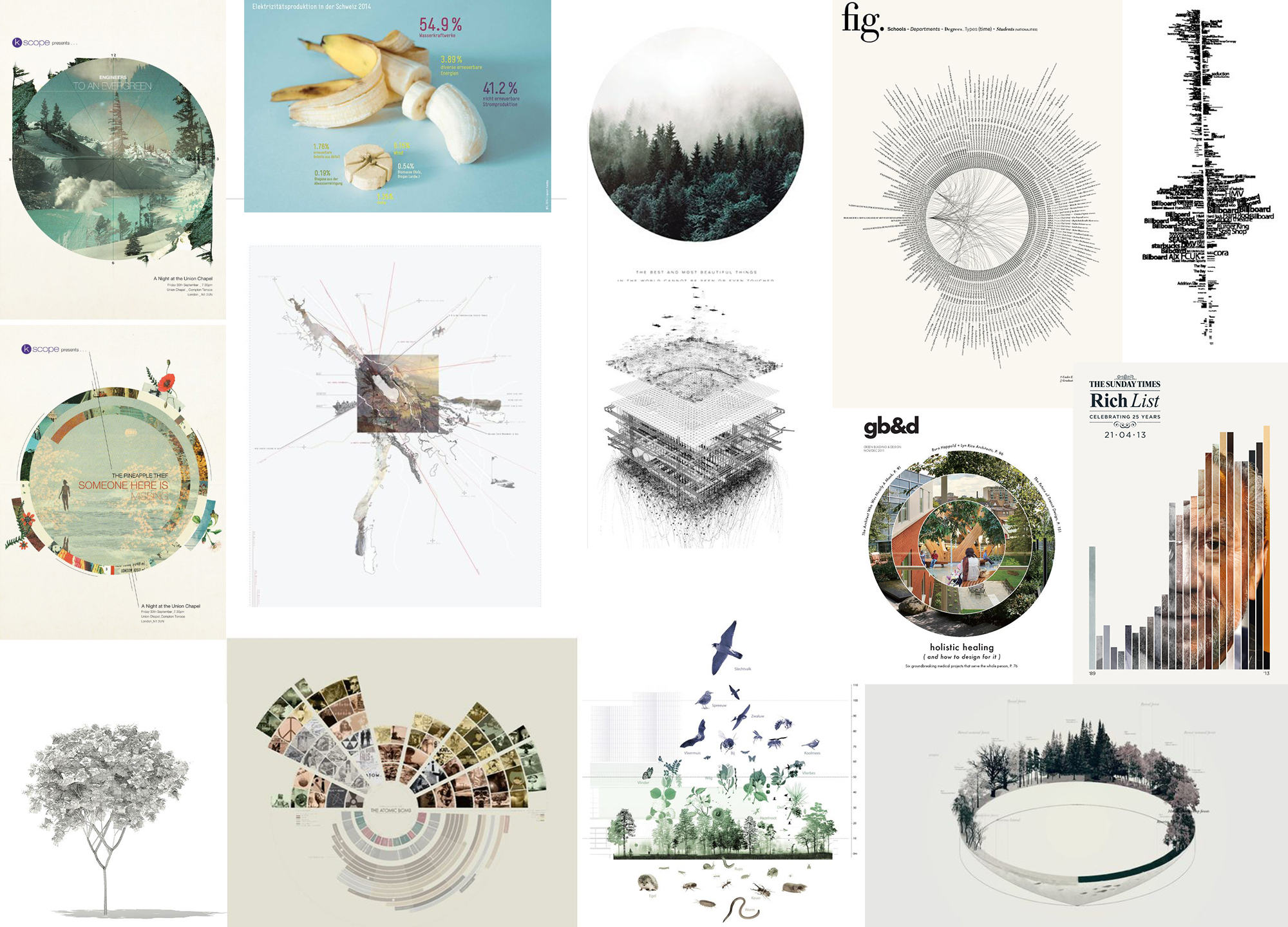 I used colours from photographs of the forest to create an authentic organic palette to compliment the natural theme. I thought that trees were appropriate to use in the infographic as they associate growth and development. The colour guide contributes to the layout creating a sense of landscape and relationship between the sky and earth. I’d like to explore the movement/ growth of the trees as a motion graphic as this would communicate the underlying themes more deeply. I’d also like to vary the tree illustrations in order to emphasise the organic forest concept.