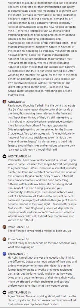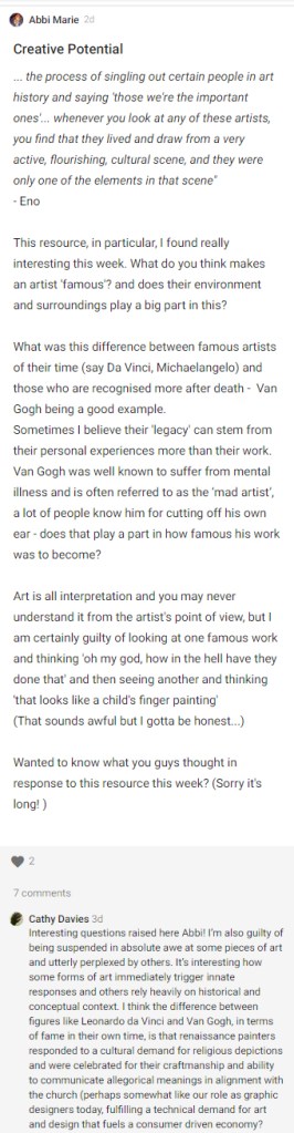 I really liked how Adrian Talbot described it as ‘retreating into a world that you own’, as this accurately describes the introspective, almost therapeutic experience of autonomous creative activity such as painting or sculpting. This weeks material has inspired me to consider future side projects which enable me to explore and contribute to subjects that I’m passionate about such as nature, environmentalism and animal rights.