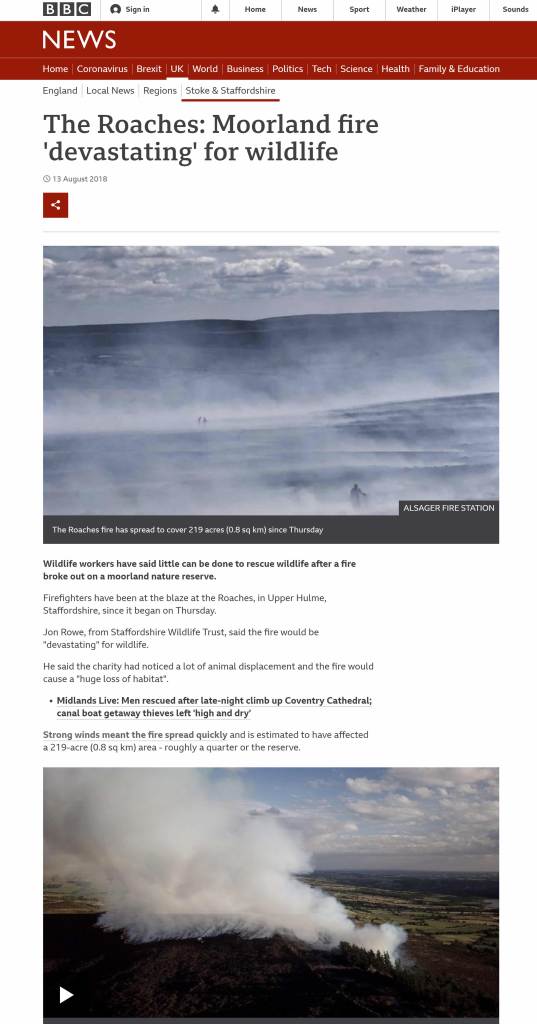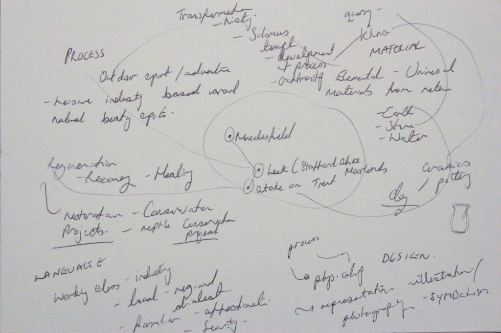 Being extremely interesting in Sam Winston’s approach of exploring in isolation, process, materials, language and design, I applied this methodology to my workshop challenge, conducting primary research with an emphasis on the ‘sensory experience’ of place and it’s influences of the ‘outer and inner dialogue’. I used photography to record unique properties of place (Staffordshire Moorlands) such as textures, sounds and processes, which triggered further research into contextual events including a devastating forest fire at The Roaches, a local beauty spot in the Staffordshire Moorlands. This more strategic process of research and dedication to ‘play time’ gave me wider access to interconnecting ideas which enabled me to generate a multi-layered response inspired by Sam Winston’s emphasis on ‘juxtaposition’, ‘speaking in multiple ways’ and ‘fraction of meaning’ between the literal, sarcastic and witty.