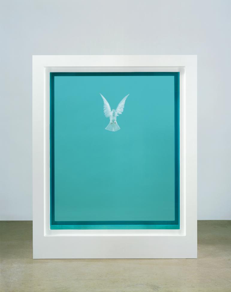 Glass, painted aluminium, silicone, acrylic, stainless steel, dove and formaldehyde solution