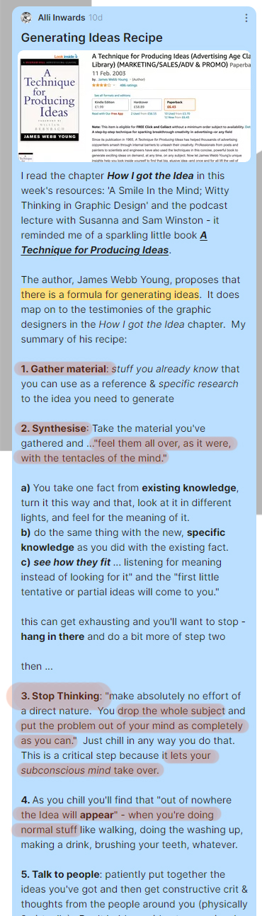 Some reflections on the ideas wall further motivated me to apply a more strategic, considered approach to the idea generation aspect of the design process. I found ‘gather material’, ‘synthesise’ and ‘stop thinking’ picked up in Alli’s reflection really helpful as they reflect the disciplined approach of Sam Winston’s idea of analysing in isolation, ‘process, materials, language and design’. When applying this to my workshop challenge, I found that I was much more open and receptive to ideas that I wouldn’t previously have access to if I had subconsciously formed a ‘predetermined’ idea of what my design would be. This required me to ‘trust’ in the process as Sam Winston discussed, and embrace the fear and apprehension of the unknown or dreaded blank page.