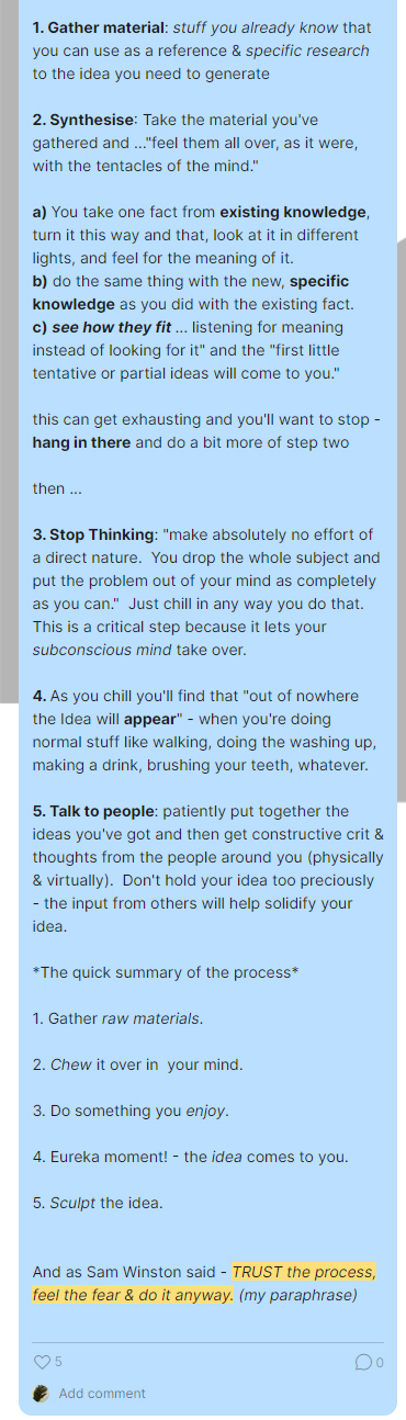 Another really important takeaway from the case studies was the importance of creating the psychological space for the generation of unique responses. A consistent theme arose regarding the context of successful ideas, for instance, Phil Carter discussed that ‘the breakthrough doesn’t always happen at work. Ideas sometimes come when I’m just about to fall asleep’. Similarly, Koestler wrote the ‘most fertile region seems to be the marshy shore, the borderland between sleep and full awakening, where the matrices of discipled thought are already operating, but have not yet sufficiently hardened to obstruct the dreamlike fluidity of the imagination’.