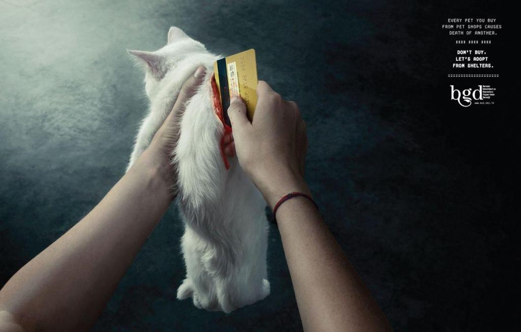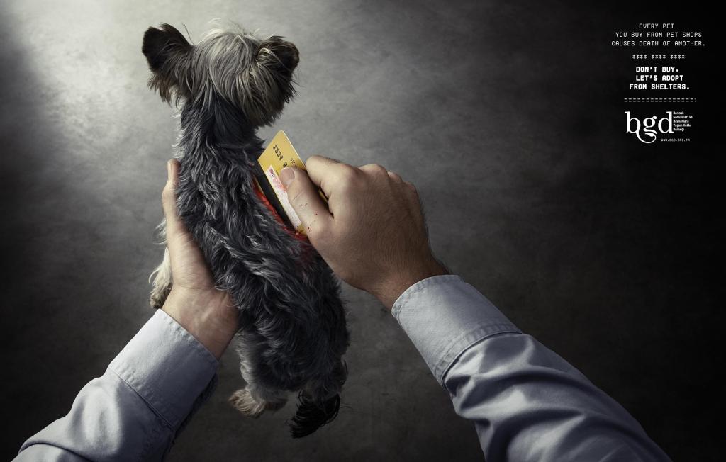 Print advertisement created by JWT, Turkey for Association of Shelter Volunteers and Animal Rights Istanbul. Inspirational campaigns that use explicit imagery within the context of traditional advertisements and marketing. The shift of application applies confrontational imagery to the conventions of advertising, inspiring moral introspection into the relationship between two juxtaposing ideas: animal welfare and money.