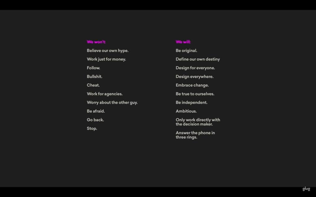 • client centred people approach – we look for people.. so we could work for Nike but what is the guy’s a dick”