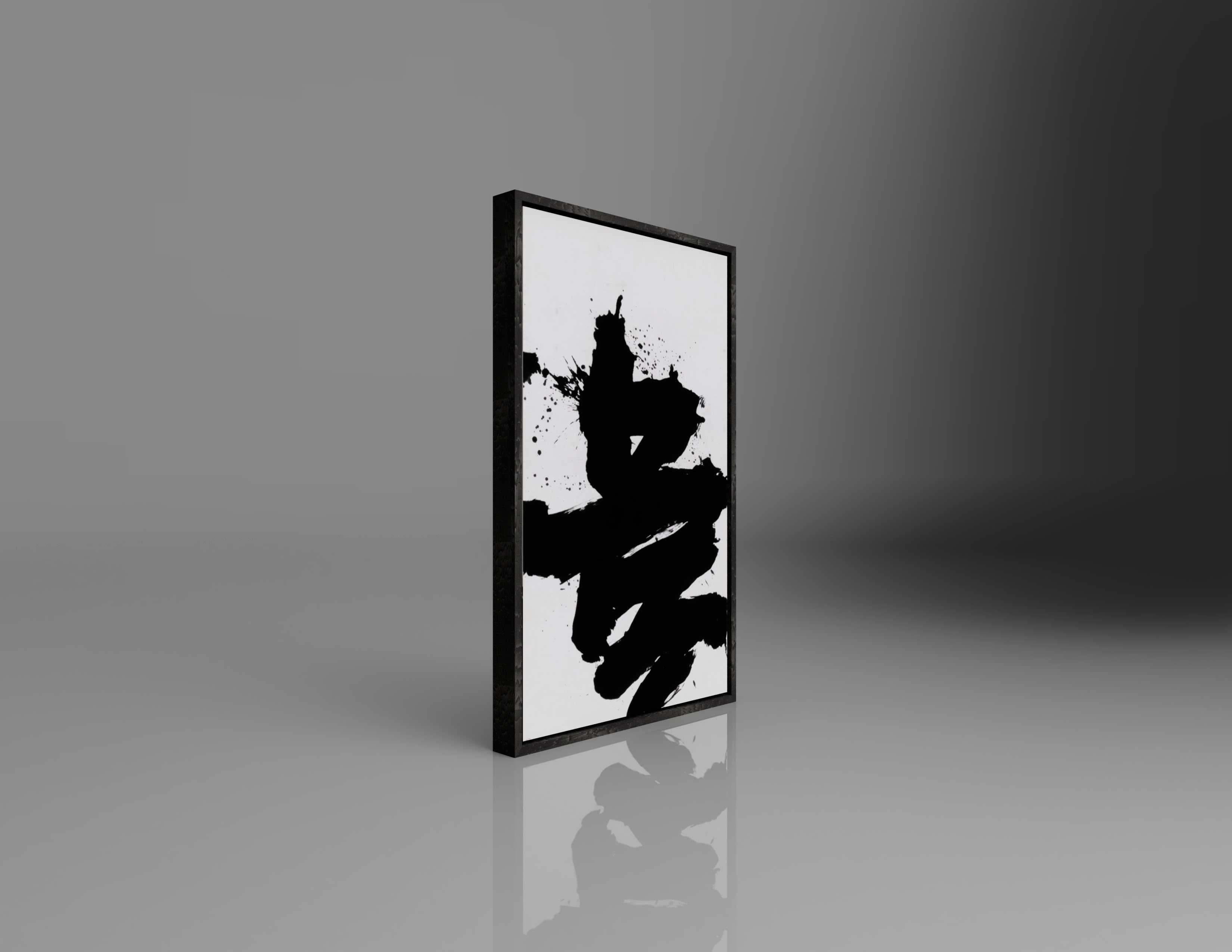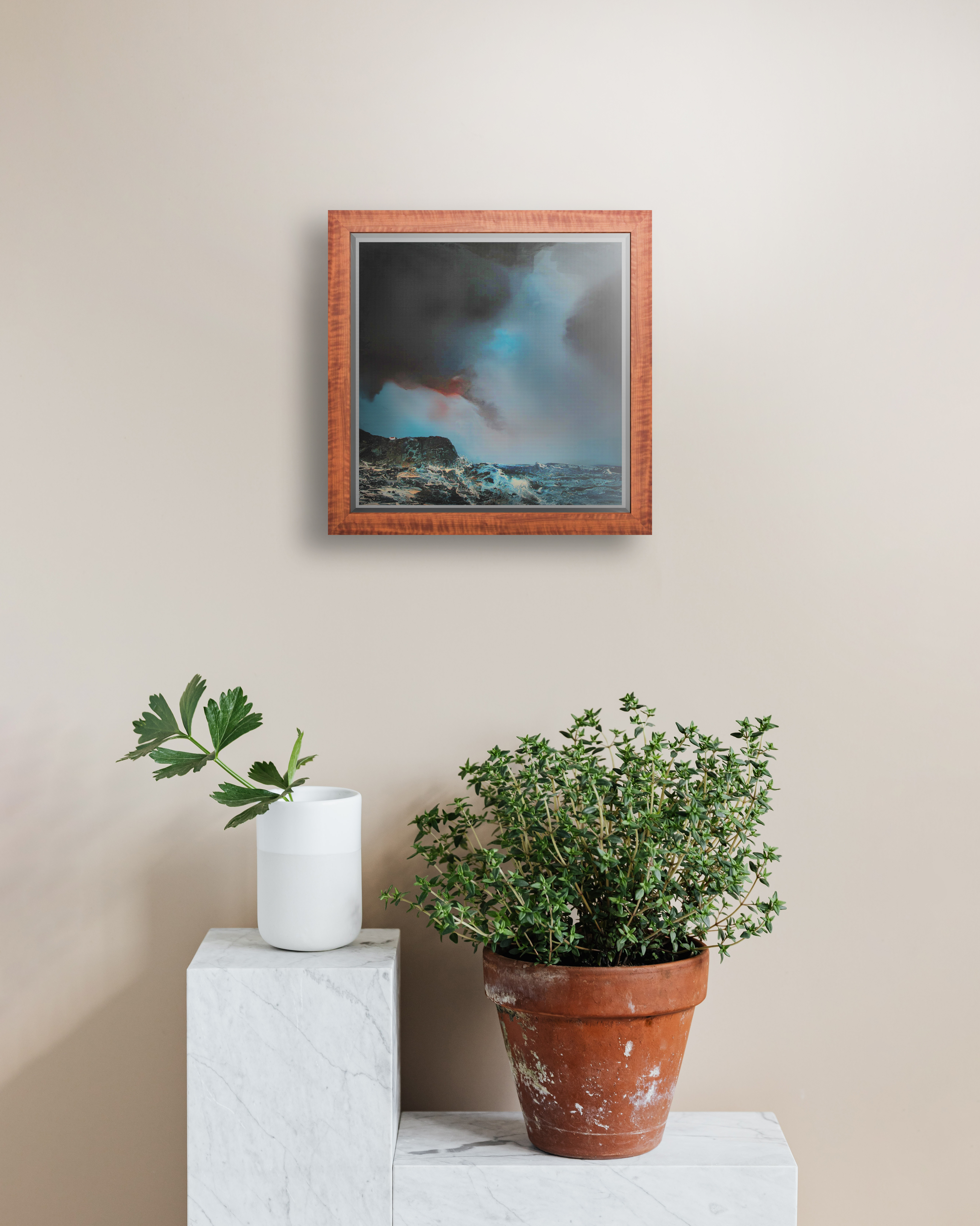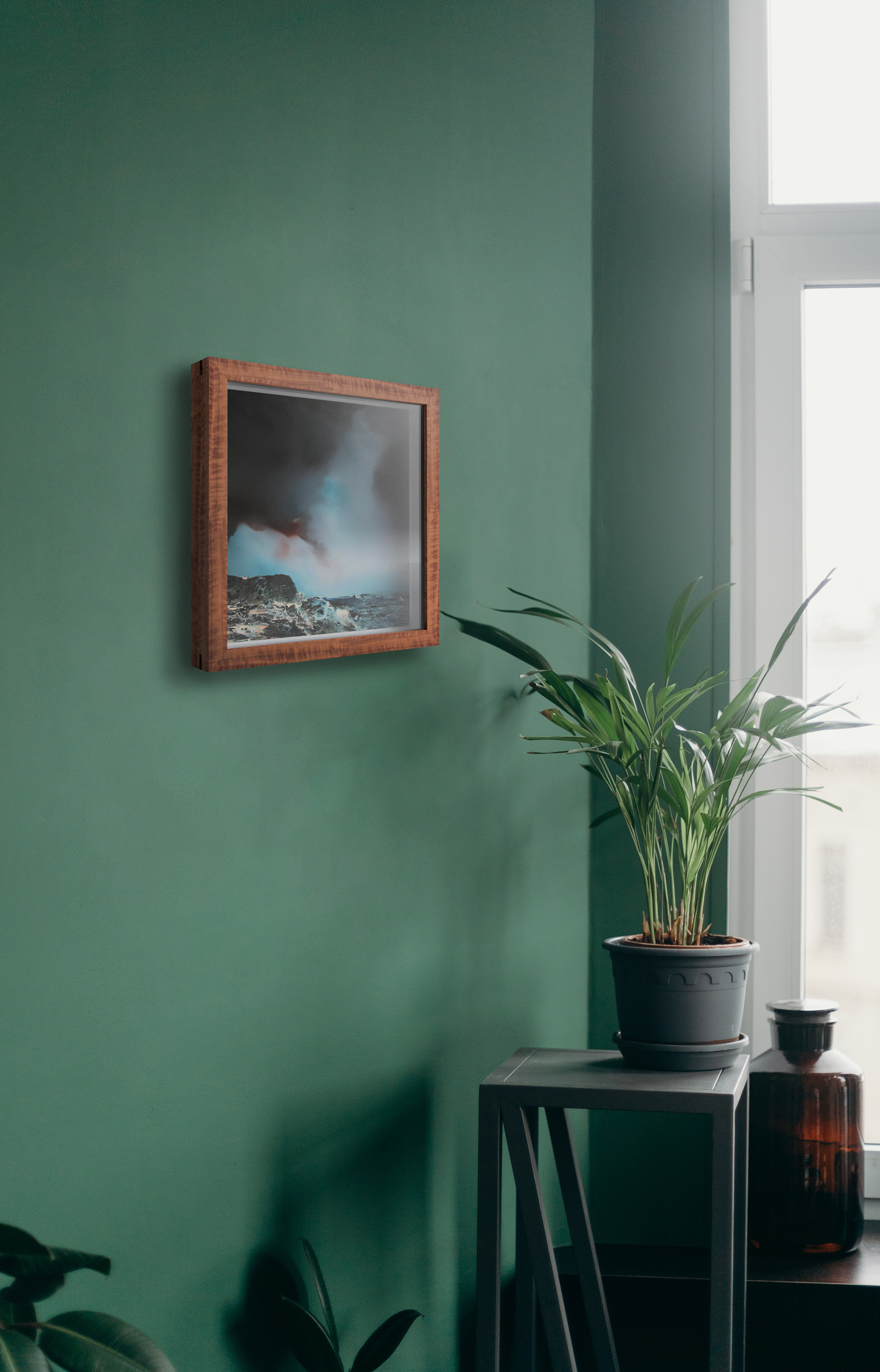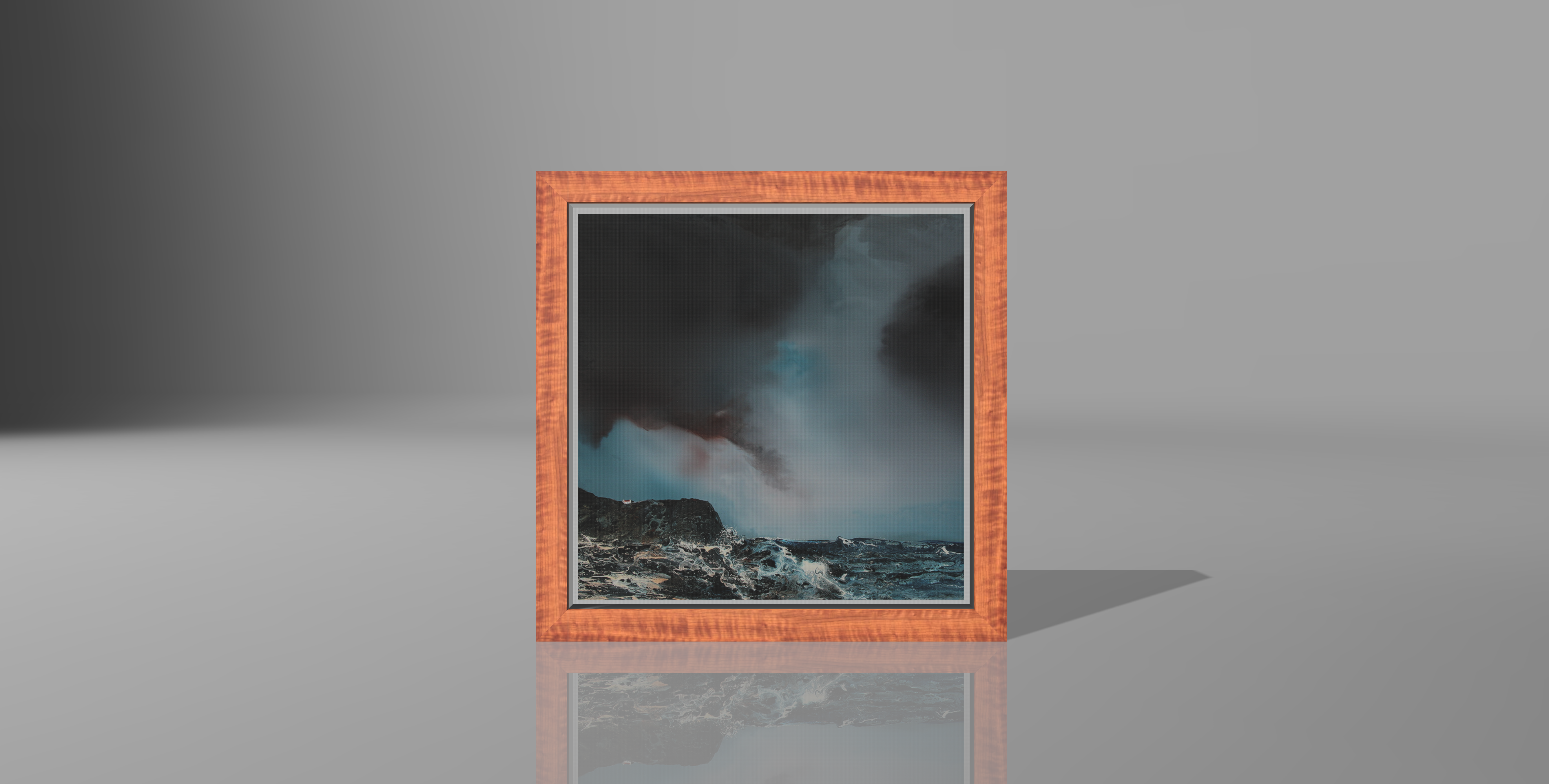 Waxed cherry wood box frame with float mounted artwork and darkened corner splines
